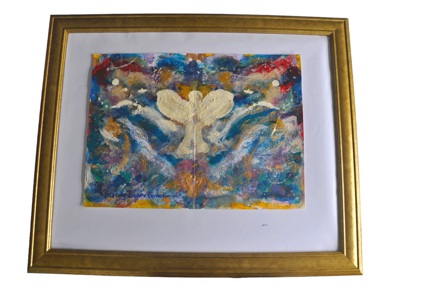 The acrylic, watercolor, collage and mixed media paintings include Visions of angels, multi-colored ethereal lights, Heavenly Landscapes, birds, hearts, Trees of Life in dazzling arrays of bright hues, soothing, elegant subtle colorations and uplifting scenes reminiscent of her experience in the Higher Realms.